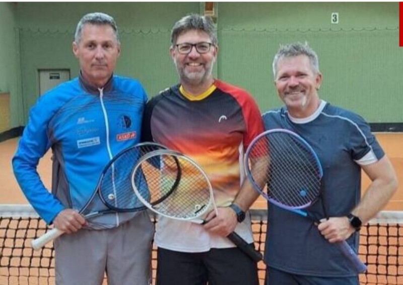 Gegen nur drei Spieler holen unsere Senioren einen glatten Sieg gegen Madainitennis. Dietmar auf Pos. 1 gewinnt den 1. Satz glatt mit 6:1, ein Konzentrationstief bringt danach einen 1:2-Rückstand, der ihn wieder wachrüttelt – 6:2. Noch schneller fertigen Alfred und Andreas ihre Gegner ab, jeweils mit einem 6:0 6:1. Im einzigen gespielten Doppel können die Gegner von Alfred und Klaus nur den 1. Satz offenhalten – 6:4 6:1. Gratulation. |