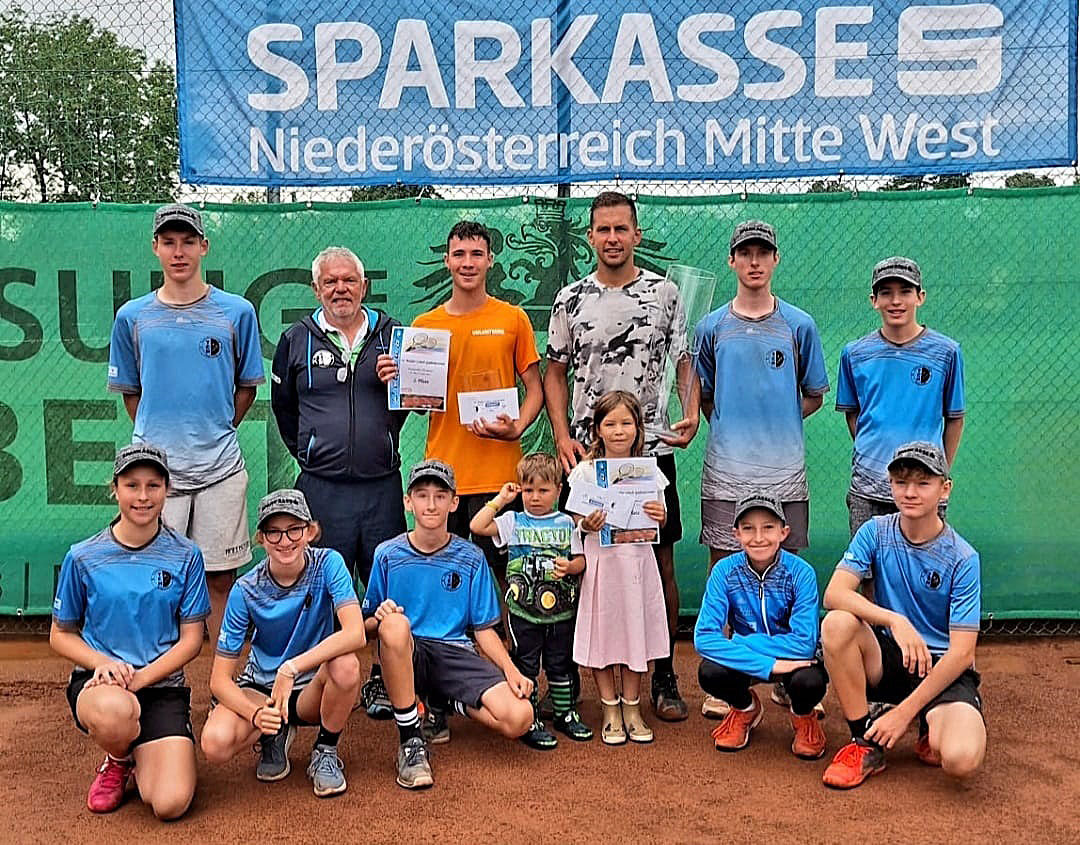 v.r.n.l: Clubobmann Dietmar Sedletzky, Kreisobmann Franz Ettlinger, Sieger Christian Kern, Obmann Stv. und Turnierleiter Michael Komma, Gerlinde Lirsch, Finalist Manuel Grünbeck, Peter Lafite (Sparkasse NÖ Mitte-West AG) und Stadtsportrat Martin Fuhs davor: die Ballkinder kamen im Finale zum Einsatz: Lisa Steindl, Julia Lienbacher, Michi Mayr, Christian Hasenzagl, Maxi Mayr und Rami Ibrahim (nicht im Bild)